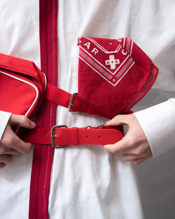 The Shirt combines classic cotton with unexpected details like plastic straps and prominent buttons, giving it a functional, edgy vibe that speaks to both durability and modern aesthetic. The Pants are crafted with a mix of cotton, polyester, and corduroy, enhanced by prominent zippers that bring both style and versatility to the look. The interplay of textures and materials captures the diversity of campus life, honoring tradition while pushing forward into modern streetwear.